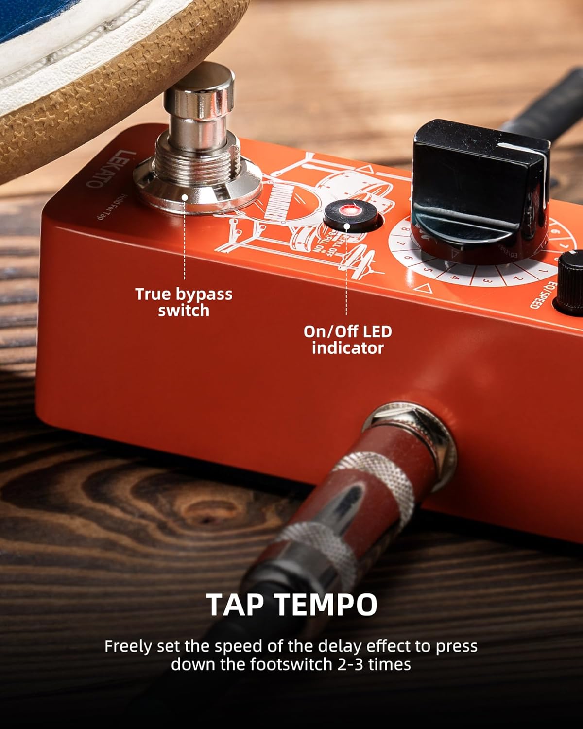 Experience intuitive and easy control with the TAP TEMPO function. A simple press of the foot-switch 2-3 times allows you to freely set the speed of the delay effect, bringing more versatility to your guitar performance. Our Drum Machine guitar pedal is engineered with high-quality real drum audio samples, letting you maintain a steady rhythm without any external drum devices.