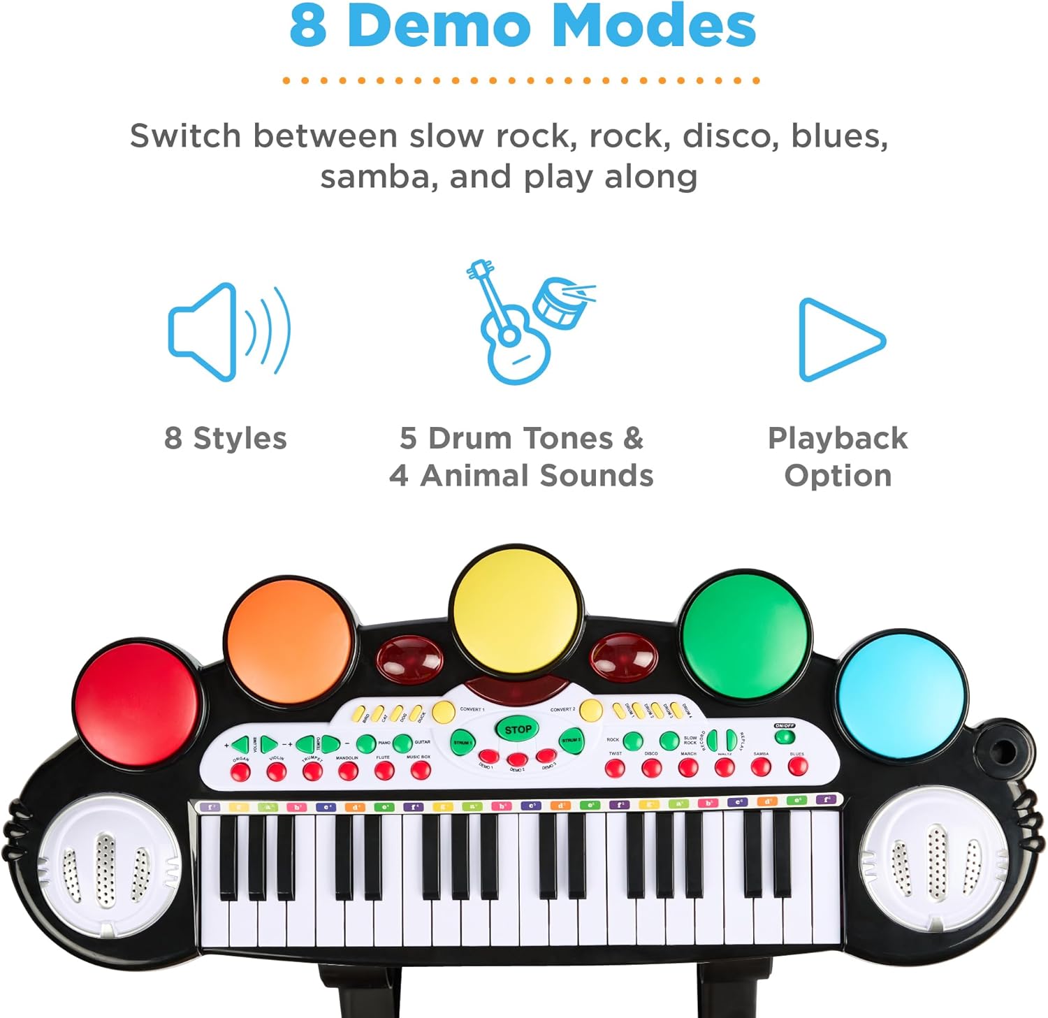 The piano’s interactive features are designed to inspire and entertain. There are 8 demo modes, letting your child switch between a range of rhythms such as slow rock, rock, disco, blues, samba, and more. This offers delightful ways to play and learn simultaneously.