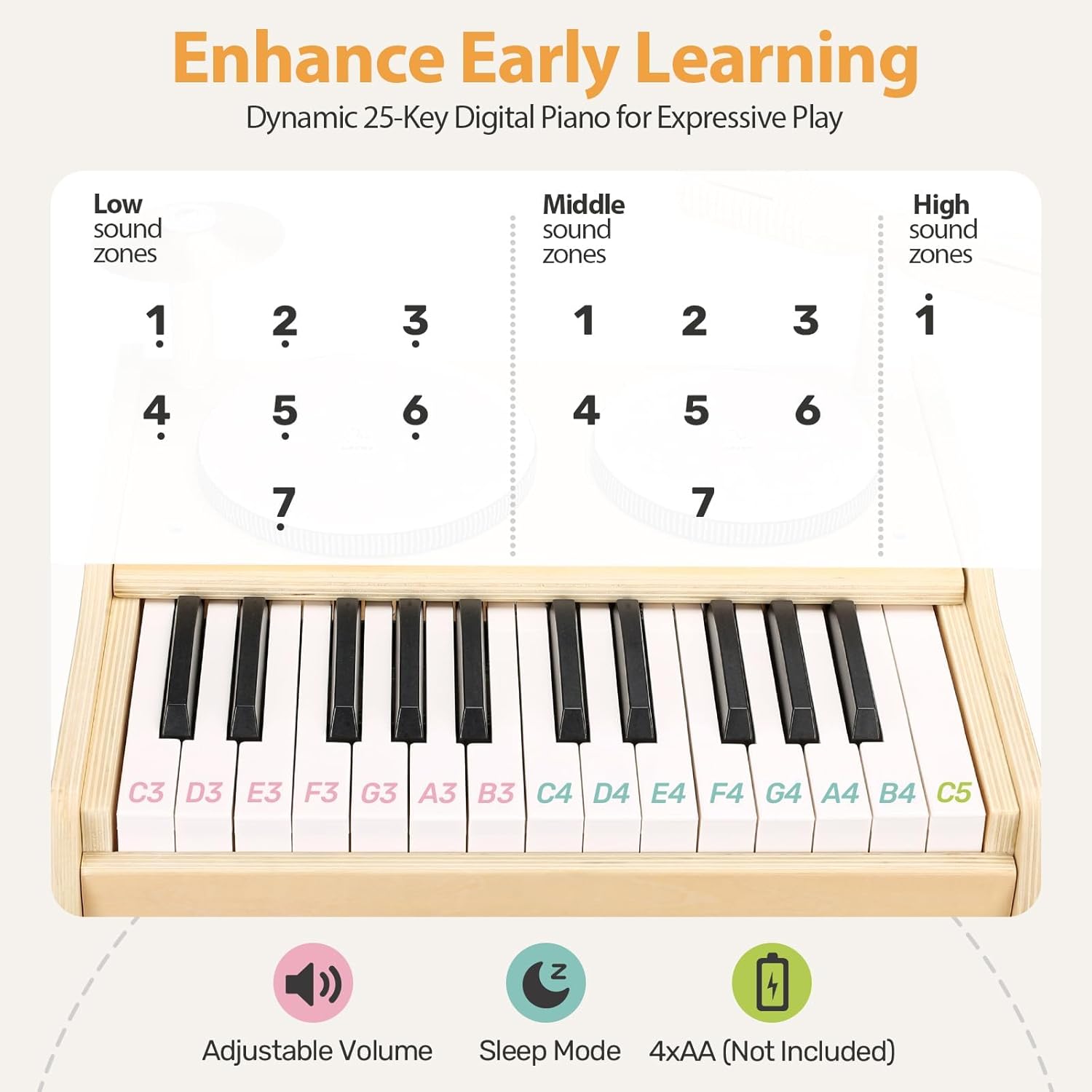 The piano’s 25 keys emulate the texture and dynamics of a real piano, providing a high-quality sound experience that your child will adore. Made with a high-quality wooden deck and polished rounded edges, this toy ensures both safety and durability. It’s also portable and compact, making it easy to transfer from room to room or take along on family trips.