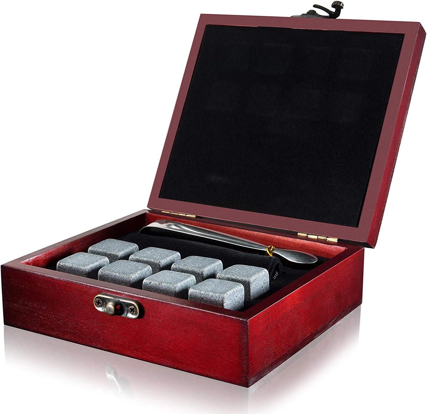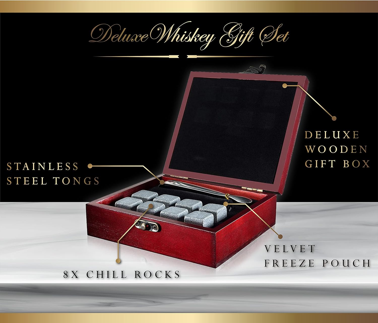 Presented in an elegant Cherry Wood Gift Box, this set also includes stainless steel tongs and a velvet carrying pouch, adding a touch of sophistication and convenience to your drinking experience. It’s the perfect gift for the spirits enthusiast or the host who has everything.